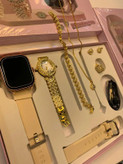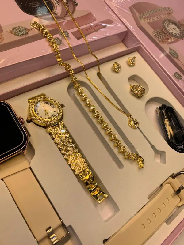 اقلام همراه پک ساعت : 1 عدد ساعت زنانه نگین دار و دستبند نگین دار، گردنبند با پلاک نگین دار , گوشواره و انگشتر ، شارژر وایرلس