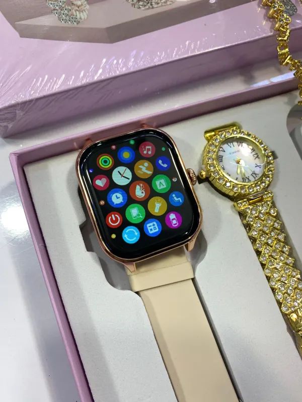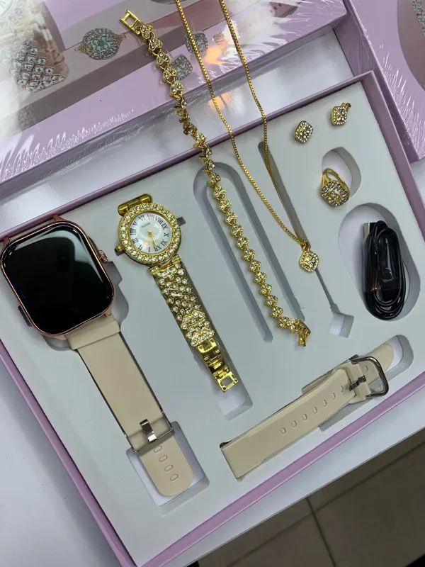 اقلام همراه پک ساعت : 1 عدد ساعت زنانه نگین دار و دستبند نگین دار، گردنبند با پلاک نگین دار , گوشواره و انگشتر ، شارژر وایرلس