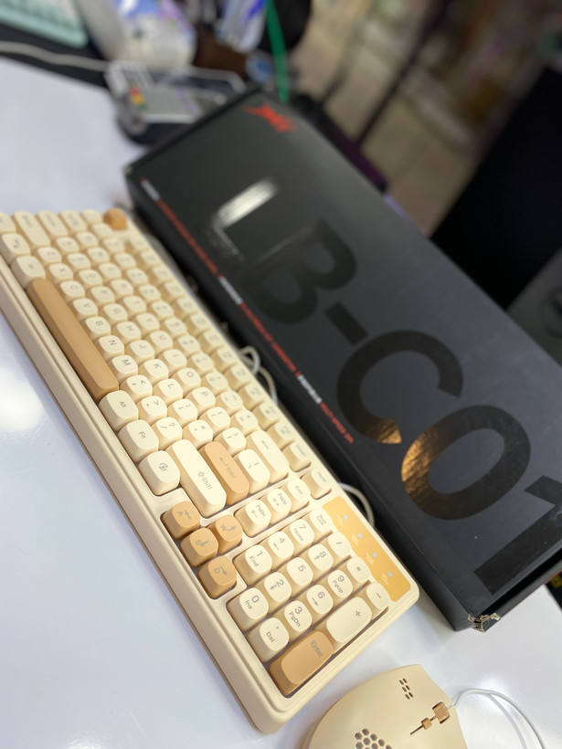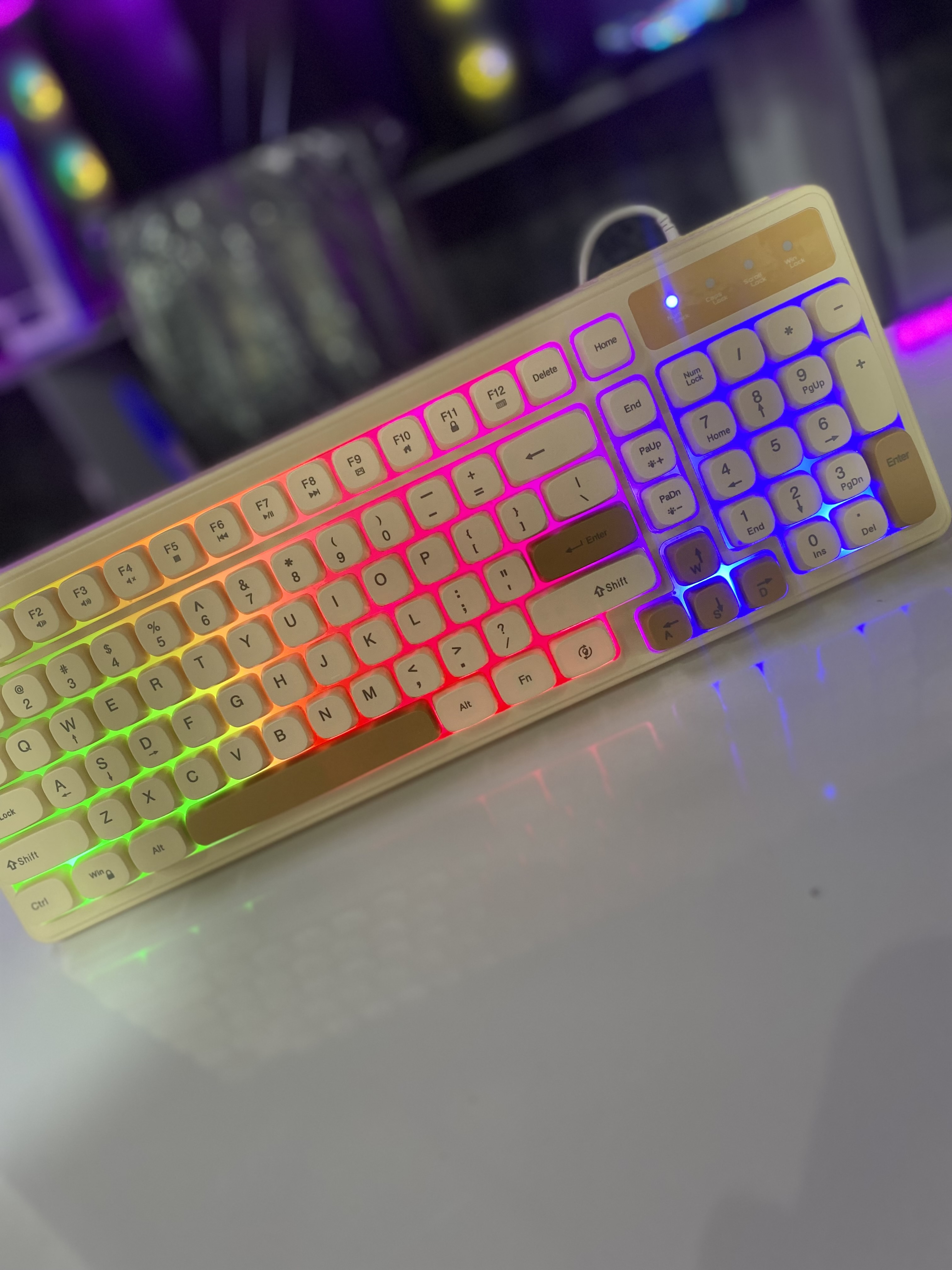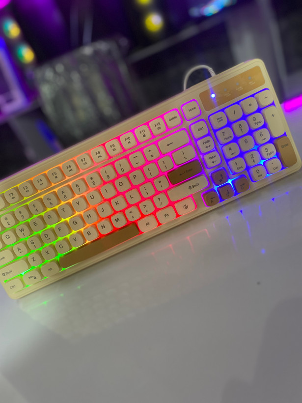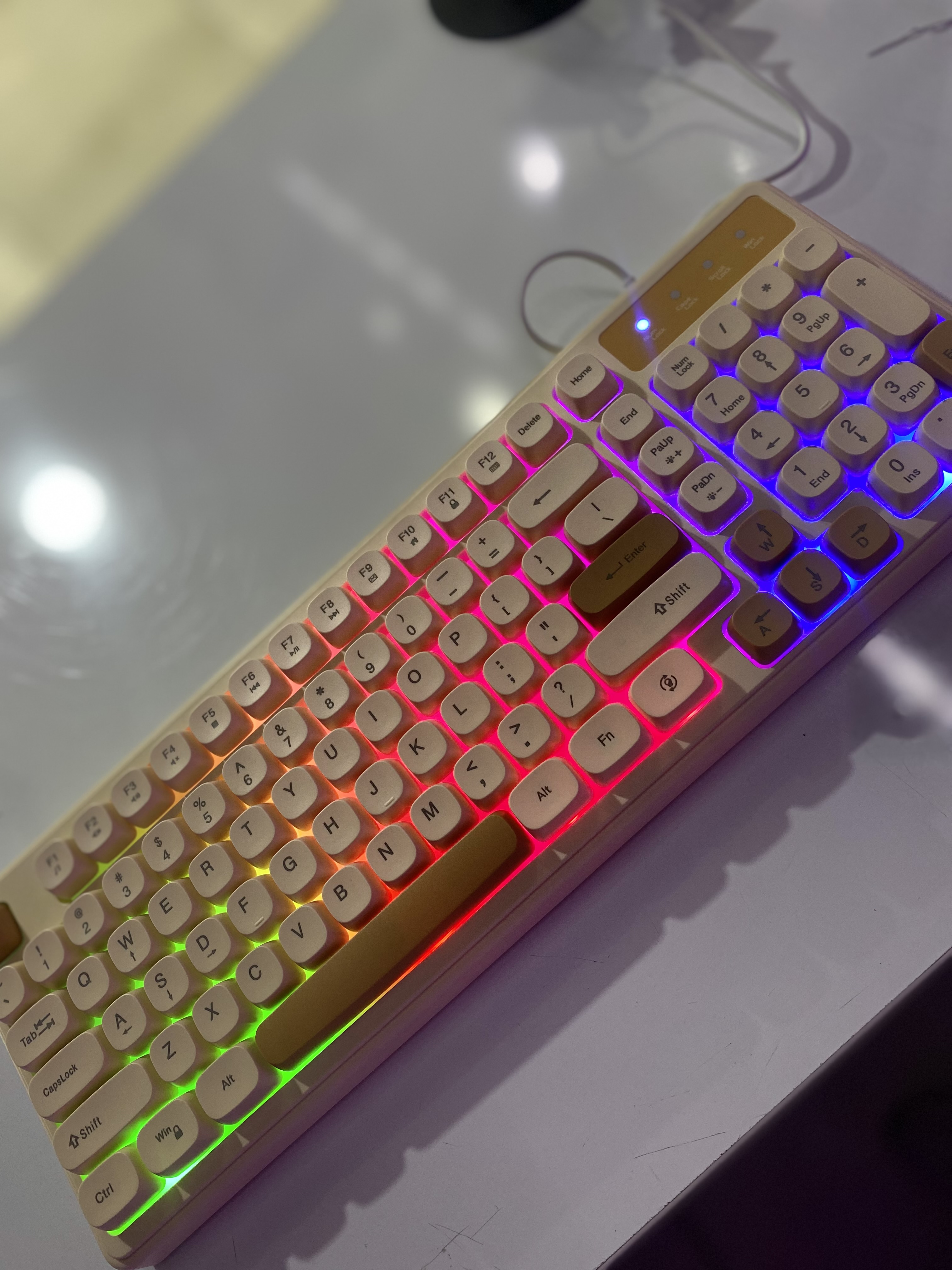 ⚙️ ویژگیها و قابلیتهای مهم نورپردازی RGB رنگینکمانی کیبورد نور بکلایت چند رنگ دارد که ظاهر خیلی شیک و گیمینگ به میز میدهد.