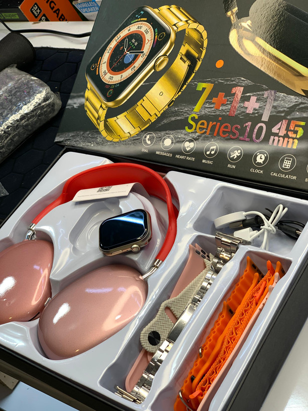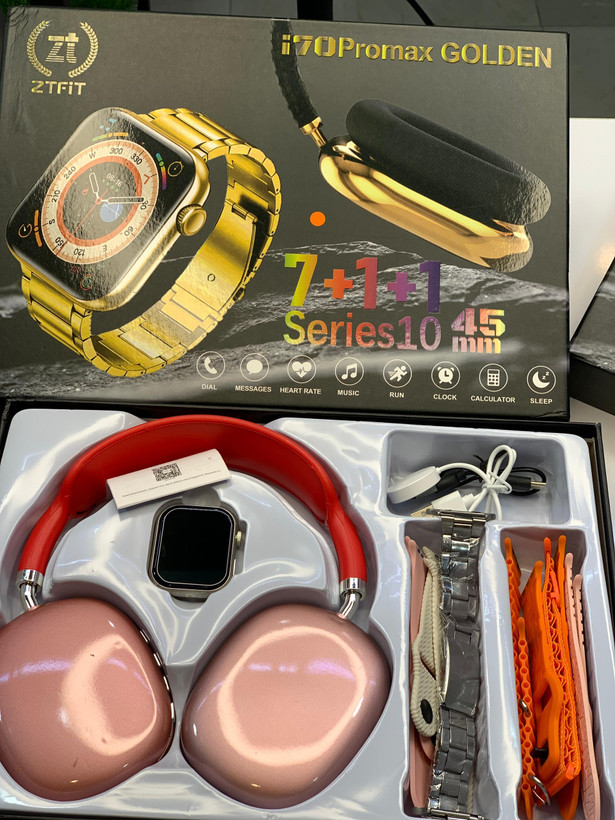 سری 10 دارای 7 عدد دستبند مناسب خانم ها وآقایان شارژر وایرلس اتصال سریع و راحت دریافت تماس و پیام سنسورهای سلامتی و ورزشی صفحه نمایش بسیار عالی ساعت golden i70 promax بهمراه هدفون P9 با کیفیت صدای فوق العاده